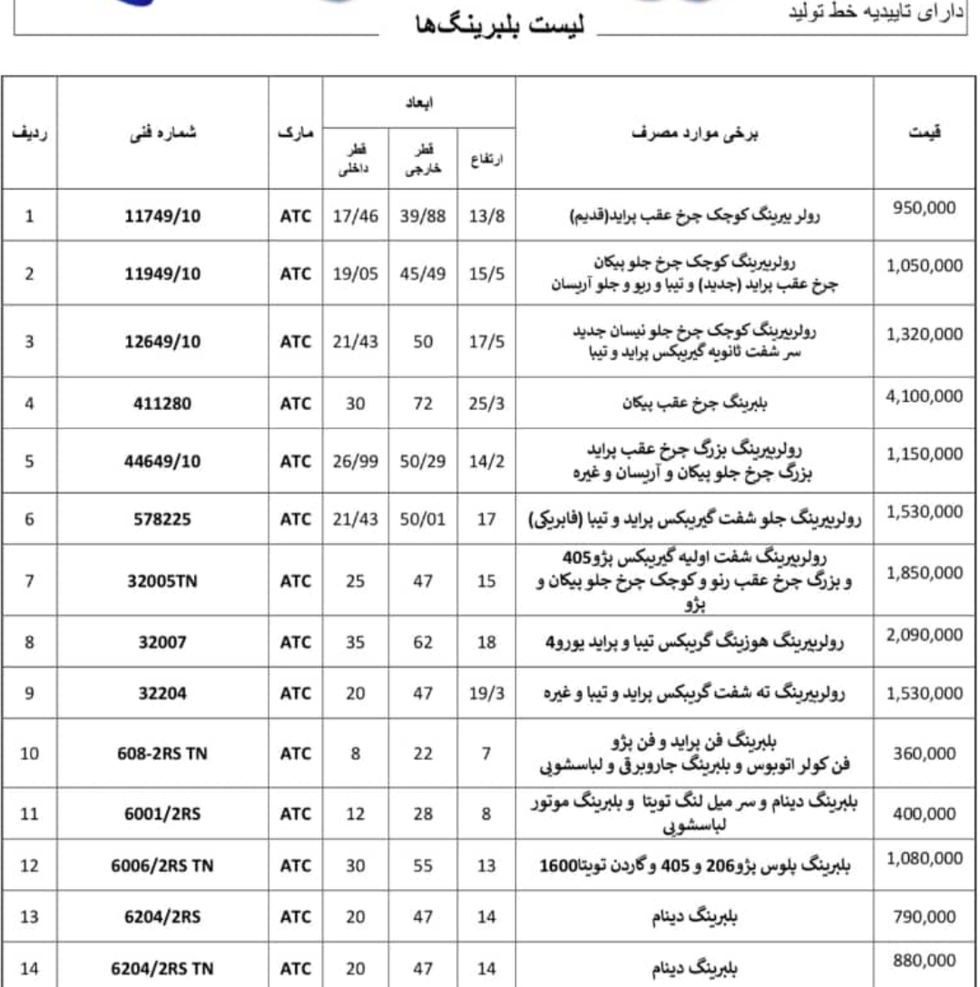 لیست قیمت بلبرینگ های ATC |