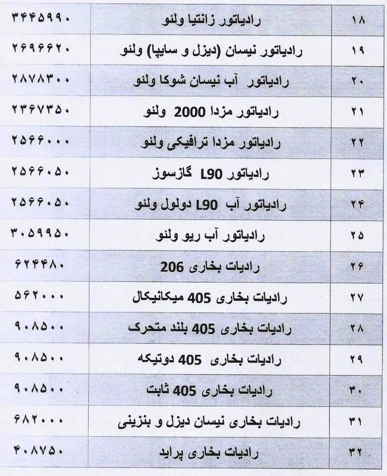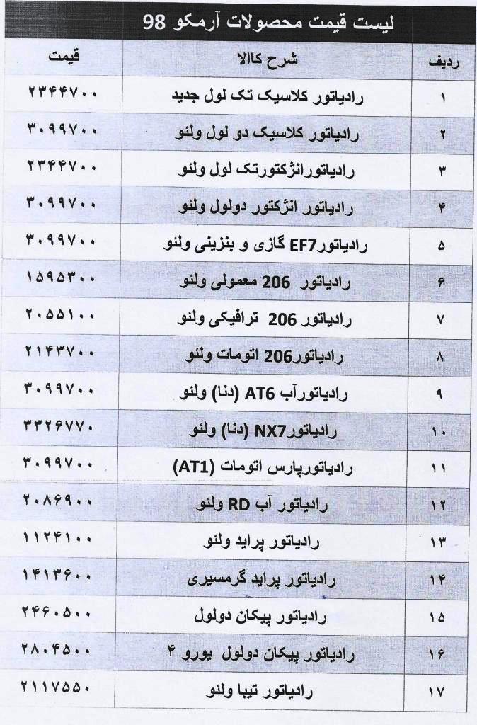 لیست قیمت رادیاتور آرمکو و والئو و رادیاتور ایران