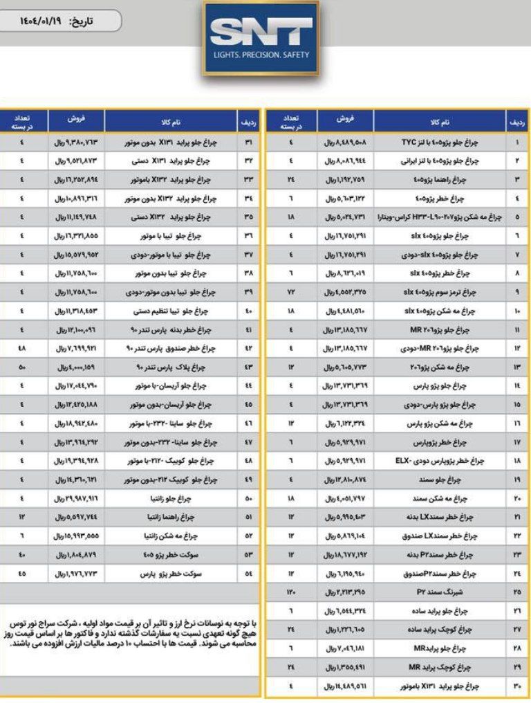 تخفیف 11درصدی لیست قیمت چراغ و آینه SNT